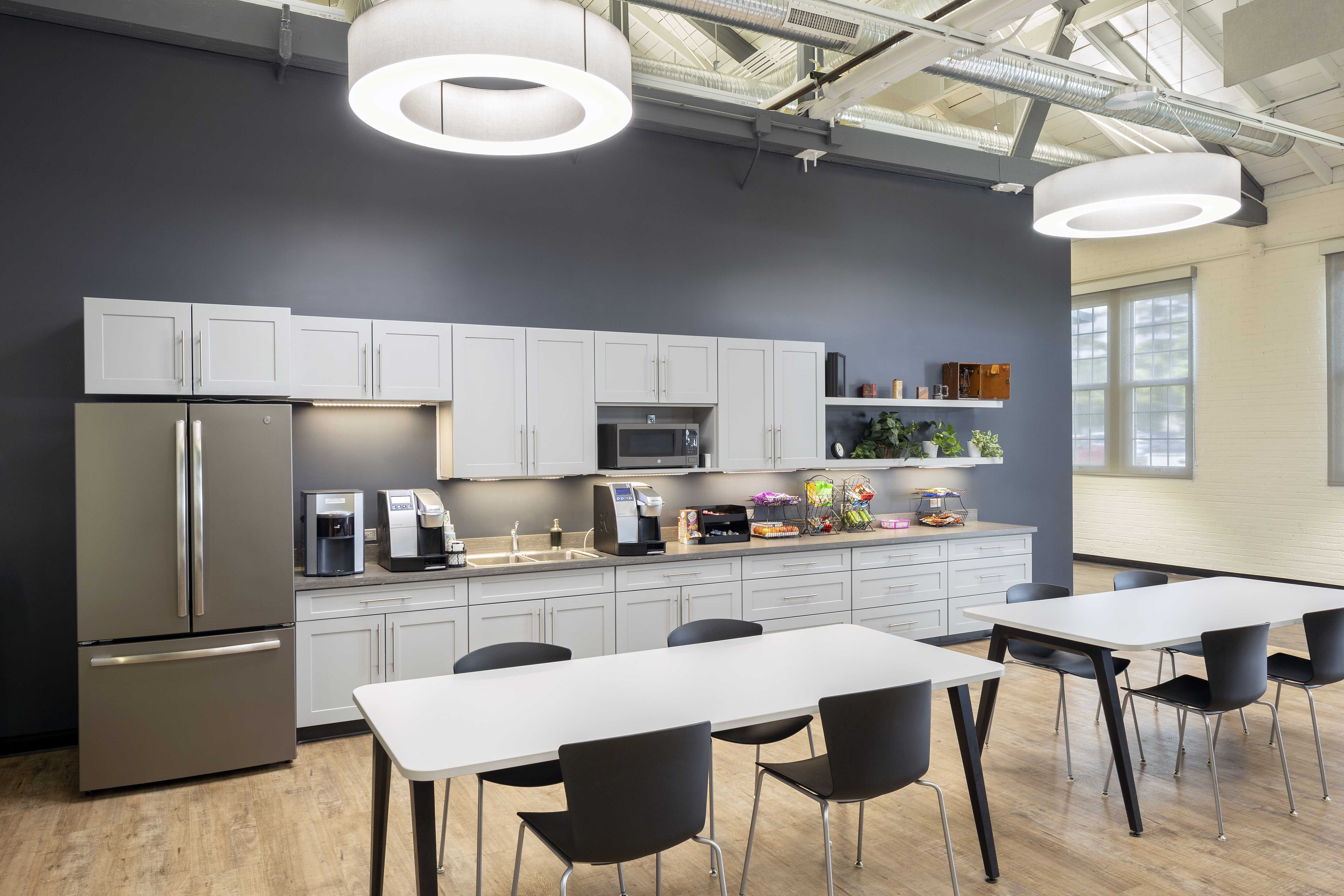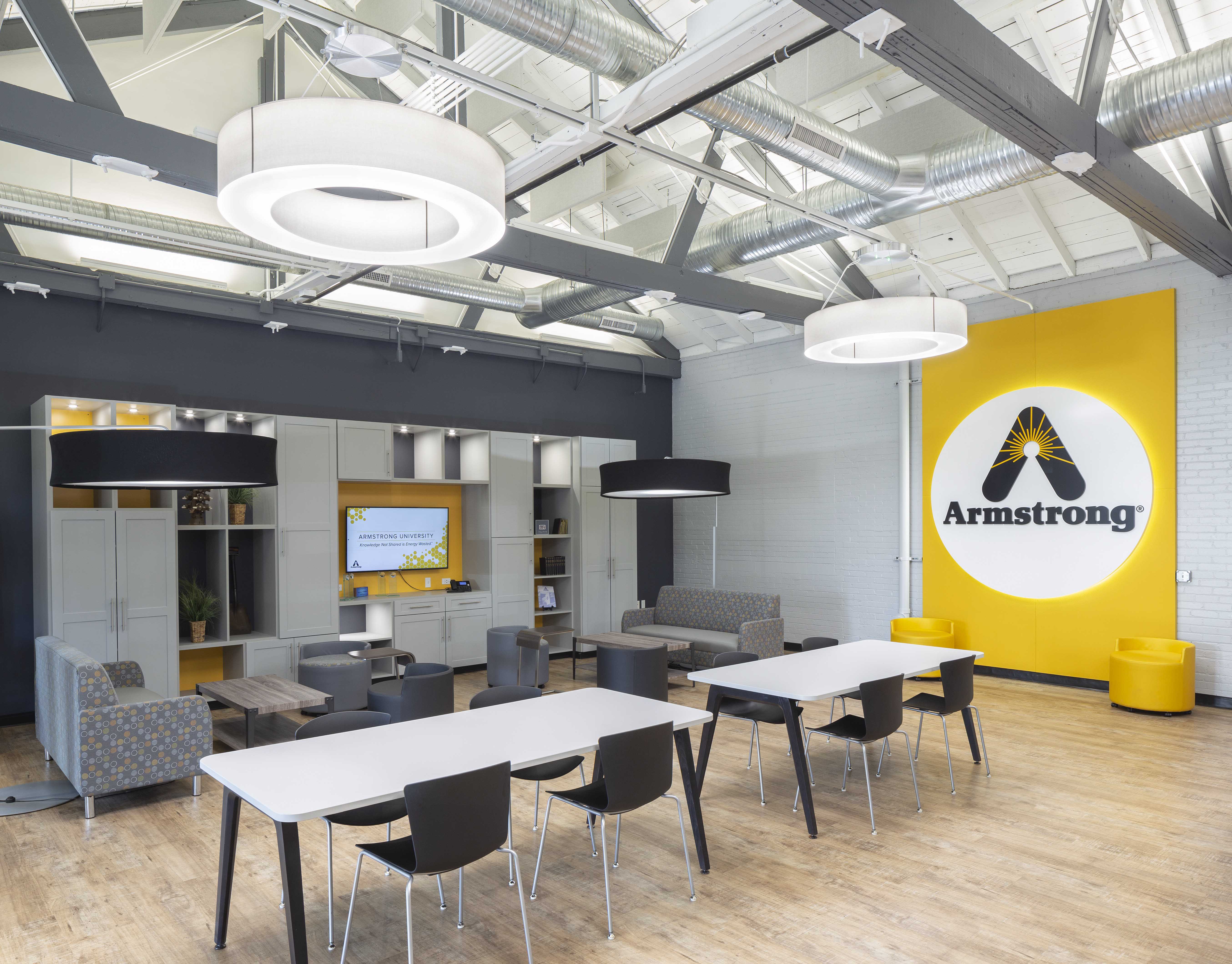 On the other side of the building is a hands-on learning lab, with four rugged metal tables ready for students to build, deconstruct, and study the Armstrong product line. Monitors for connecting to personal devices and HVAC systems are mounted above each table. In the center, a large, comfy lounge with soft seating for small group meetings, movable tables, and a kitchenette.