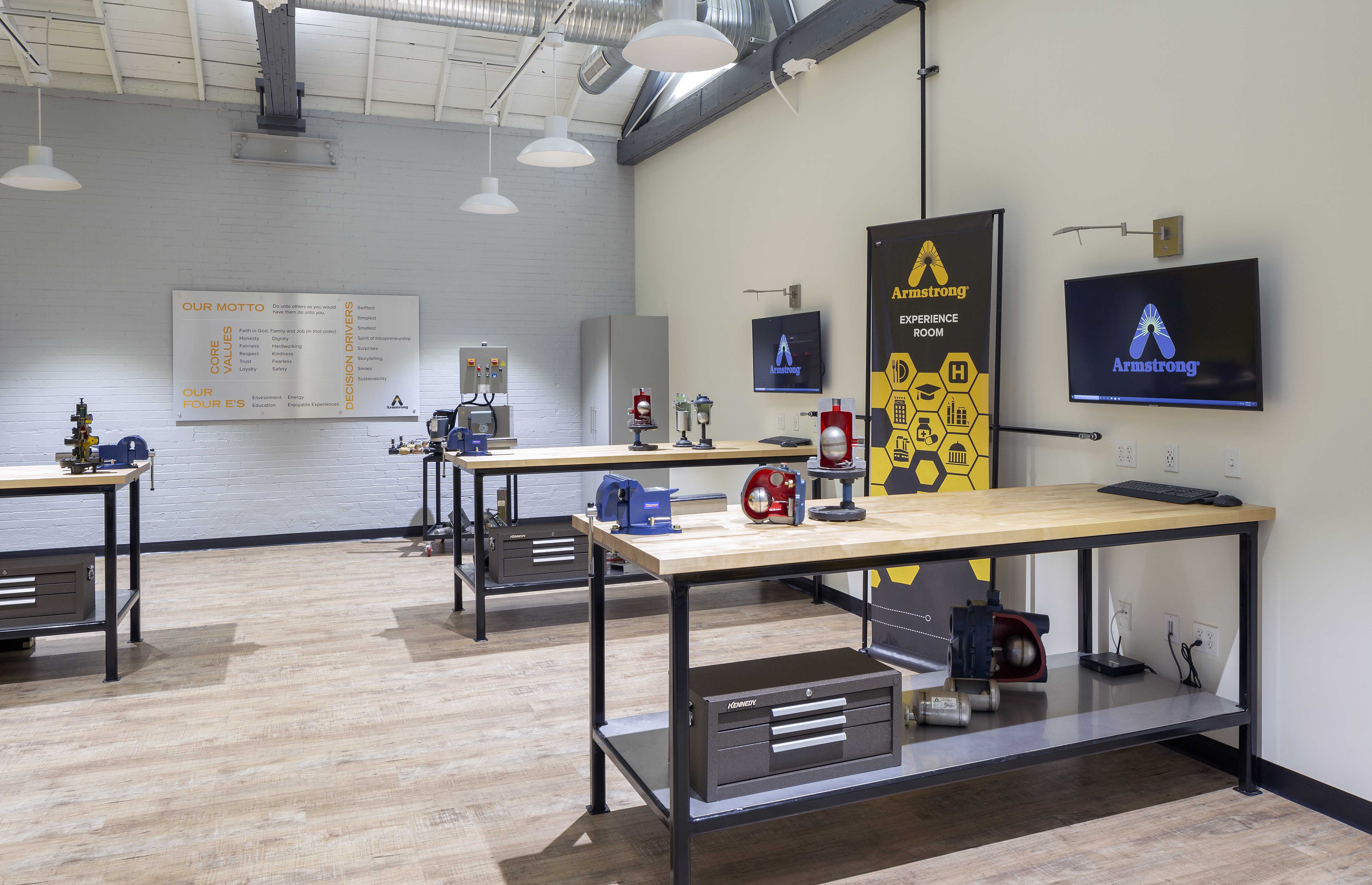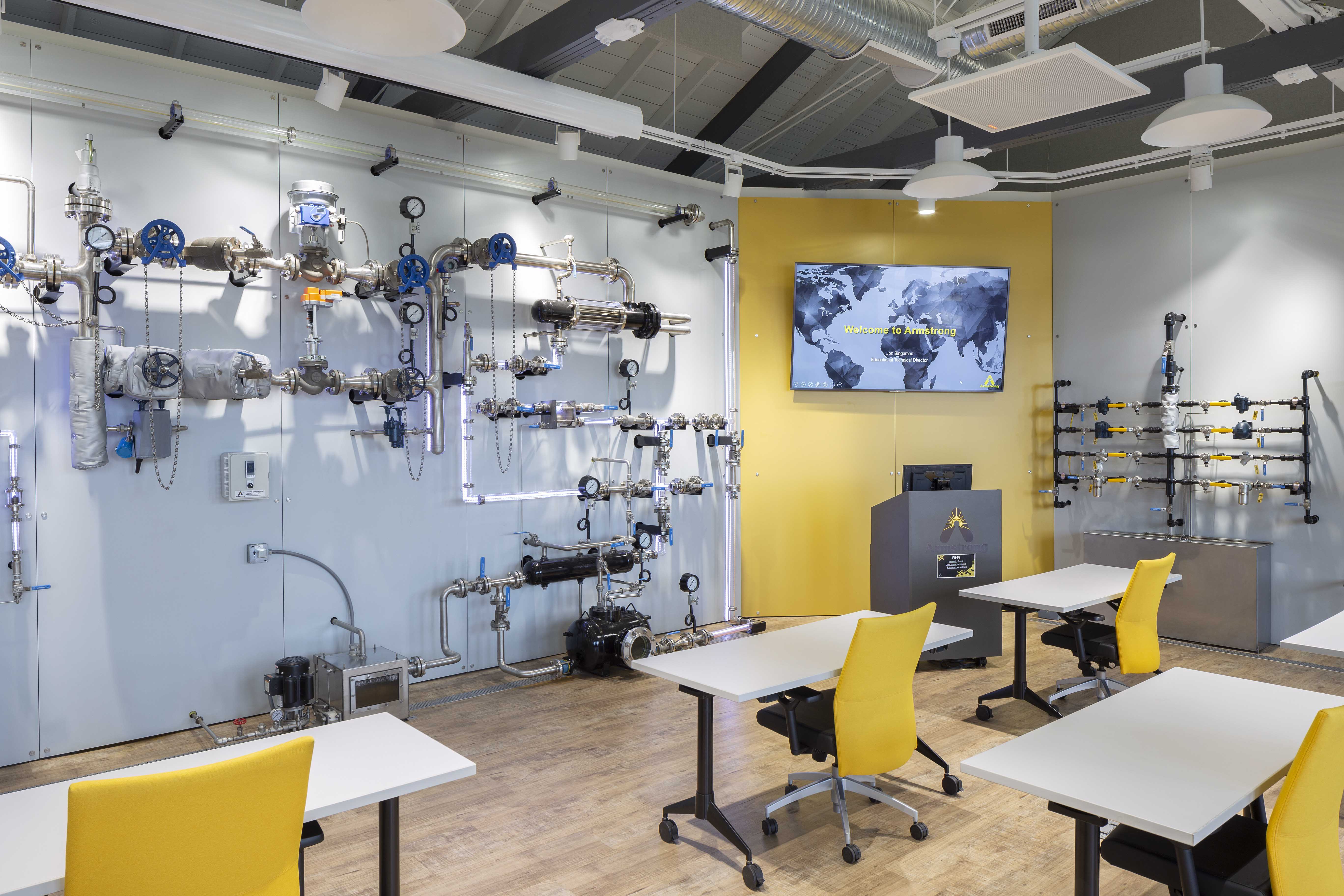 - State-of-the-art learning lab featuring example Armstrong systems installed on a large wall panel. A false wall allows the systems to be easily accessed for troubleshooting and to be replaced as technology advances.
