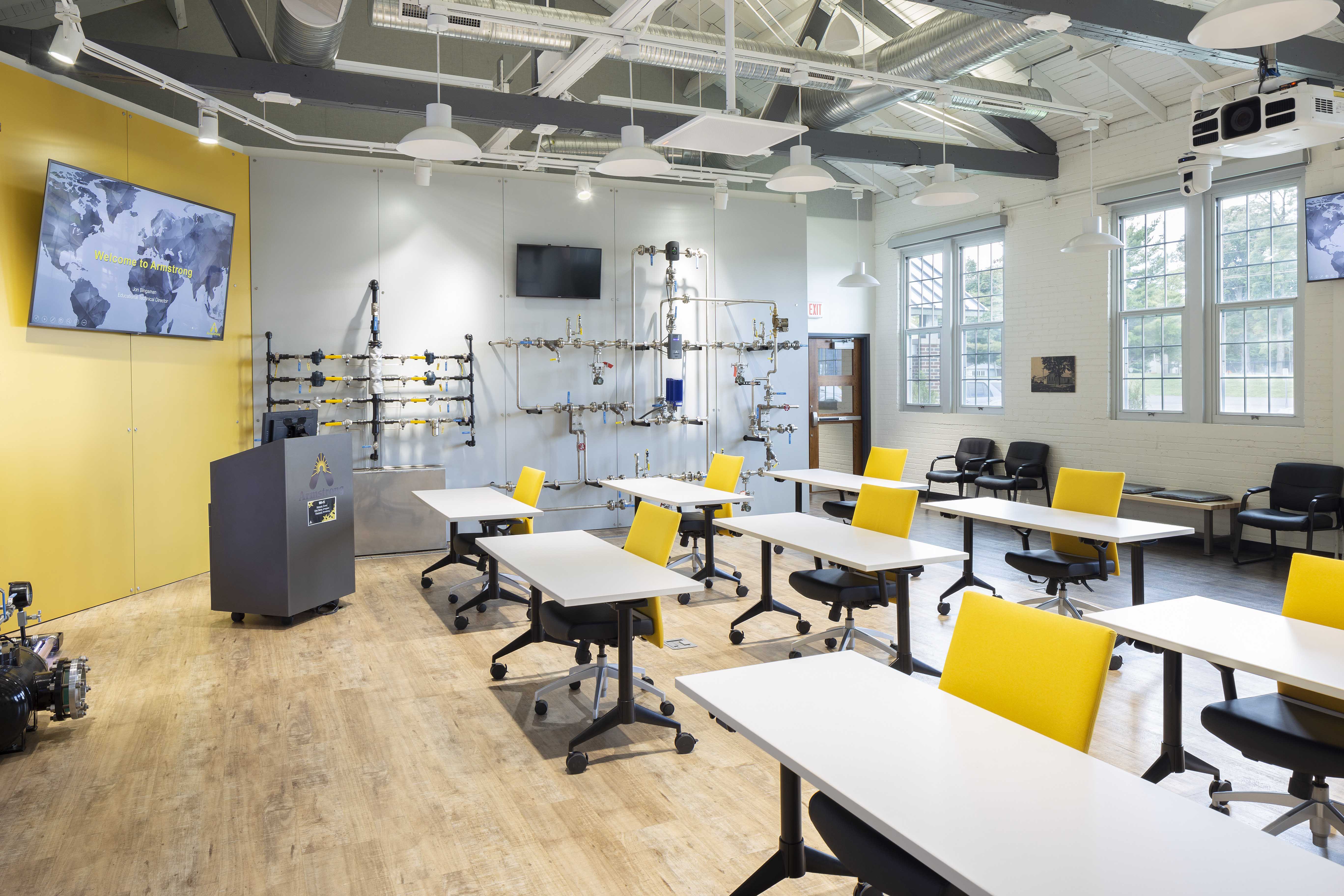 The new Learning Center combines the best of both worlds, leaving the exposed trusses and original brick, the walls adorned with historical photos of workers and events past. The classroom is outfitted with the most up-to-date steam technology, with fully functioning systems placed on the false walls. These systems can be switched out as the product line changes, allowing the Learning Center to adapt. A lecturer stand and computer allow the teacher to modify the workings of the steam systems on the wall, with displays around the classroom mirroring the computer.