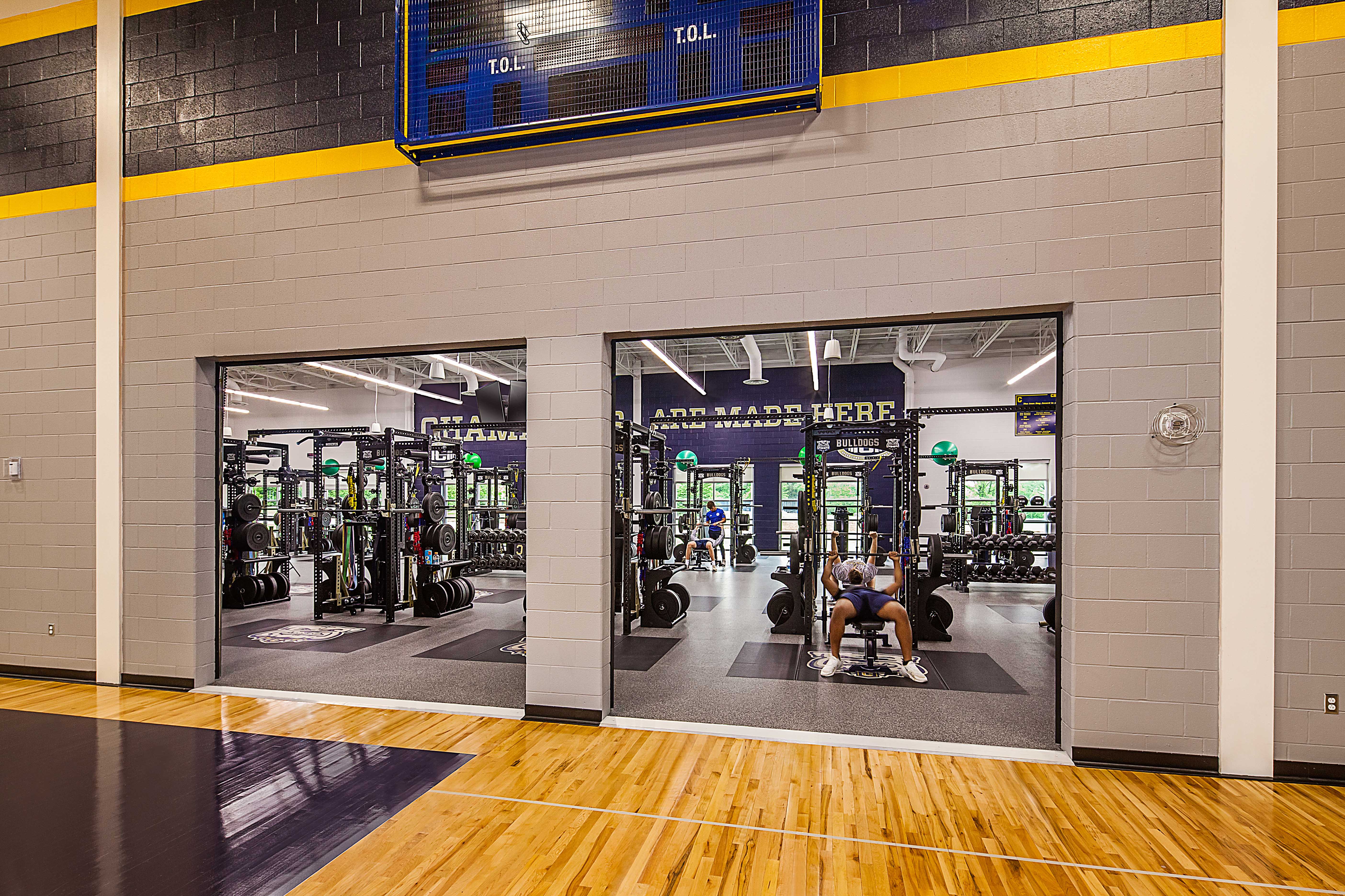 - Overhead glass doors between auxiliary gym and weight room for easy access, supervision, and dual use of the spaces